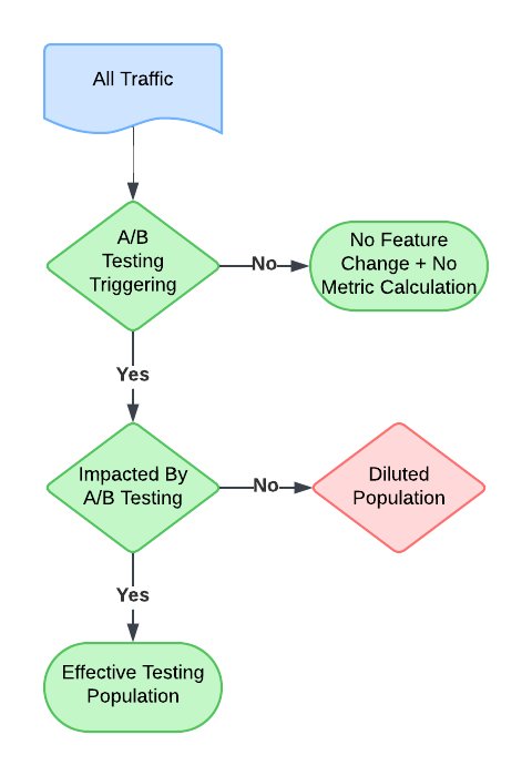 As previously mentioned, the dilution effect occurs when unrelated traffic is included in the experiment, introducing additional and unnecessary noise into metric calculations and reducing the overall efficiency of the experiment.