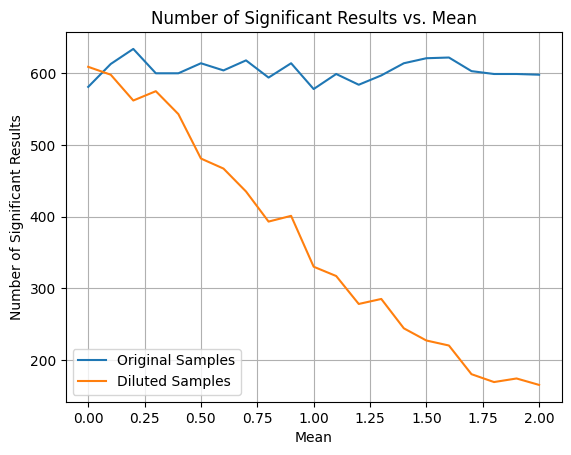 before and after diluted and check if the p-value is smaller than 0.05. We repeated this process for 1000 times and count how many times the related test will be significant.